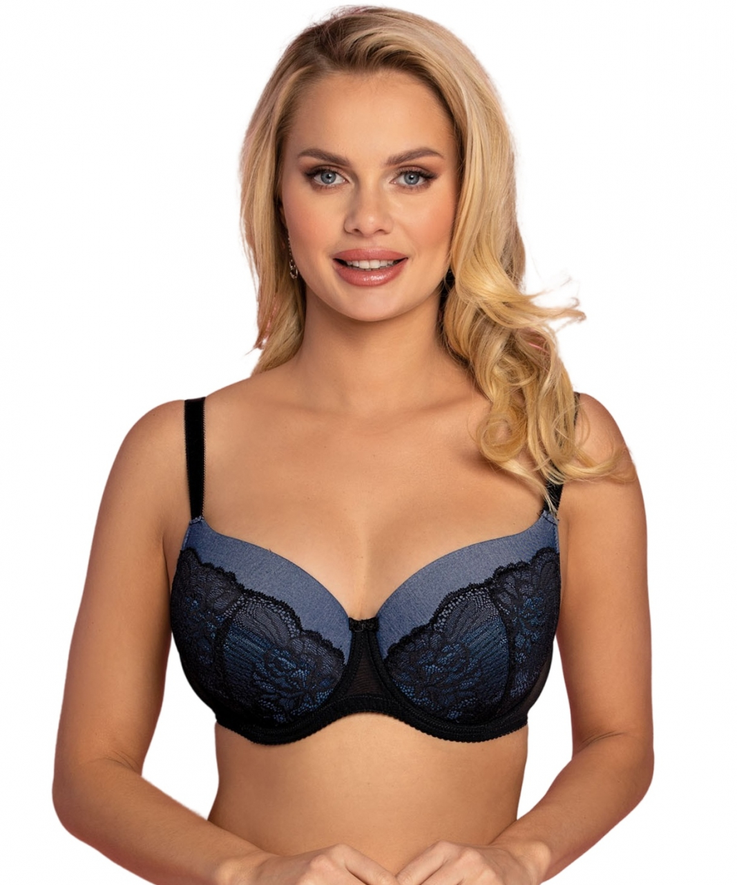 Elegancki biustonosz usztywniany. Górna część miseczki wykonana jest z materiału imitującego jeans, dolna część miseczek pokryta jest koronką. Brak pionowych fiszbin bocznych. Między miseczkami kokardka, ramiączka regulowane, nieodpinane. Tył z siateczki, zapięcie na haftki.